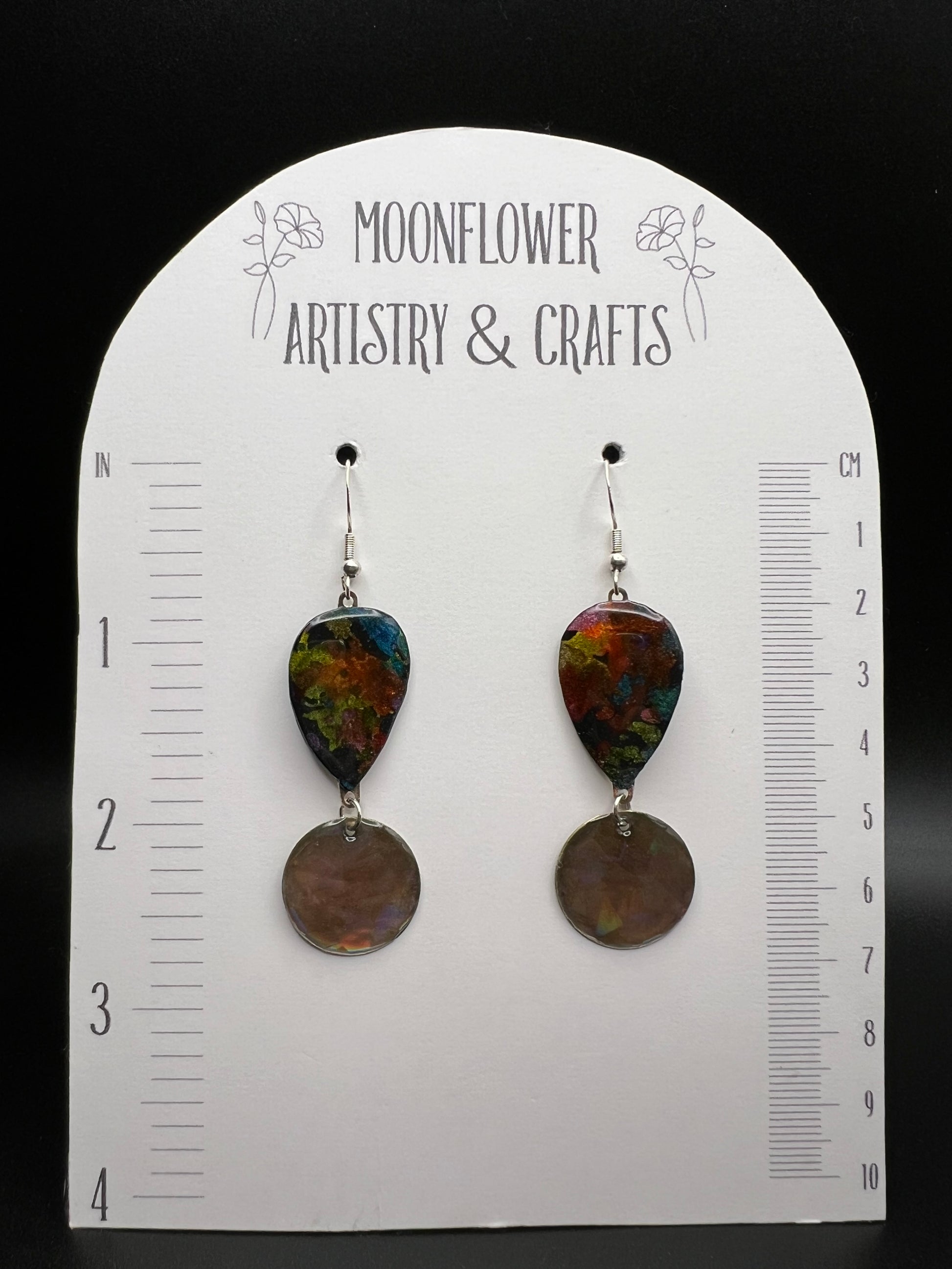 These Large Marbled Earrings showcase intricate paint and inks on metal, sealed with resin for a smooth, durable finish. Each pair is fitted with sterling silver hooks, ensuring comfort and hypoallergenic wear. Perfect for adding a sophisticated, artistic touch to any outfit.